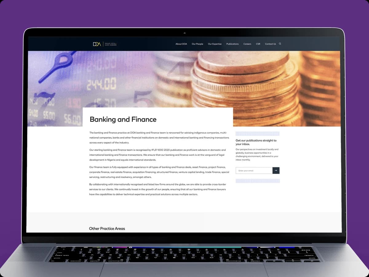 We structured a detailed “Practice Areas” section to help visitors quickly understand the firm’s range, from Banking & Finance to Energy & Natural Resources. Each area is clearly explained, giving prospective clients confidence in DOA’s expertise and making it easy to find the right legal service.