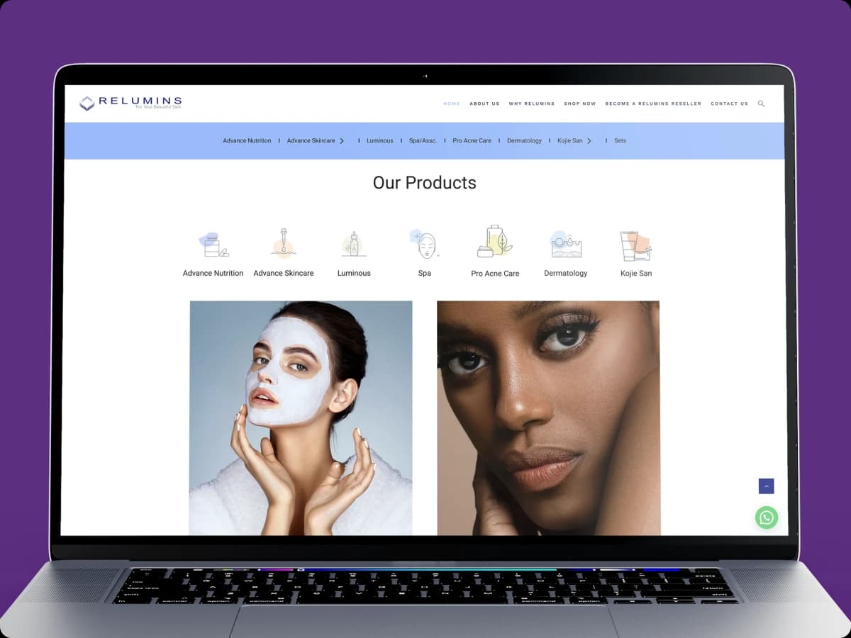 The website design echoes the premium feel of the Relumins brand with clean layouts, clear typography, and soft color accents that complement their product range. We ensured consistency with the global brand while tailoring the Nigerian site for local relevance, including calls-to-action to drive reseller inquiries and product education.