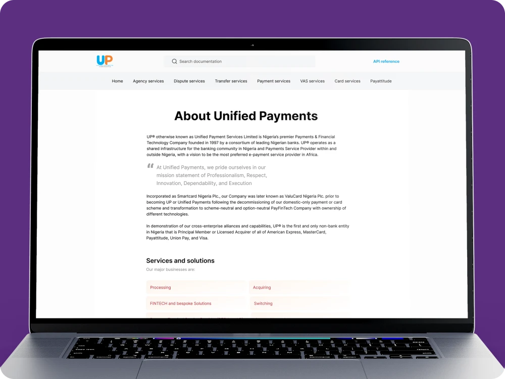 Unified Payments (UP®) is Africa’s first and only non-bank entity licensed as a principal member and acquirer of all major card schemes. To align its digital touchpoints with its tech-forward vision, Unified Payments engaged Mactavis to develop an integrated API Documentation Portal for all it's digital products and services including PayAttitude.